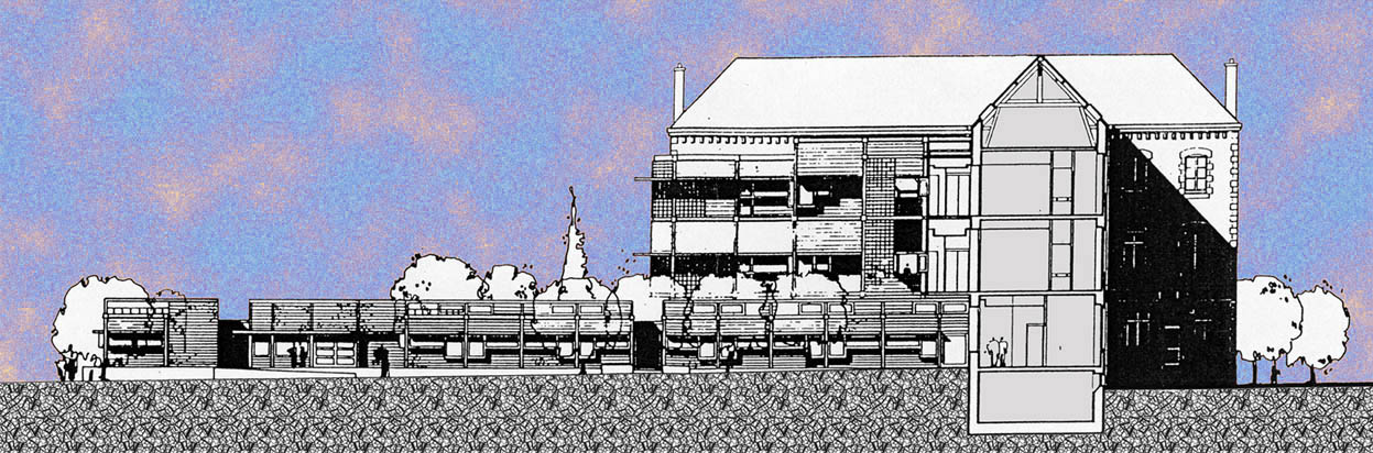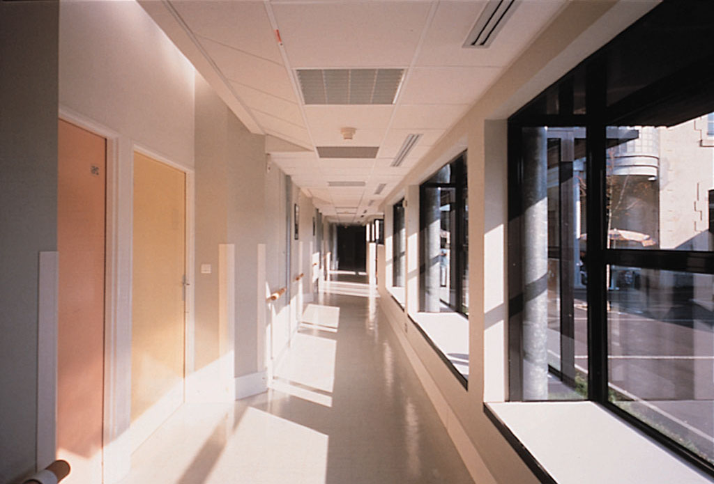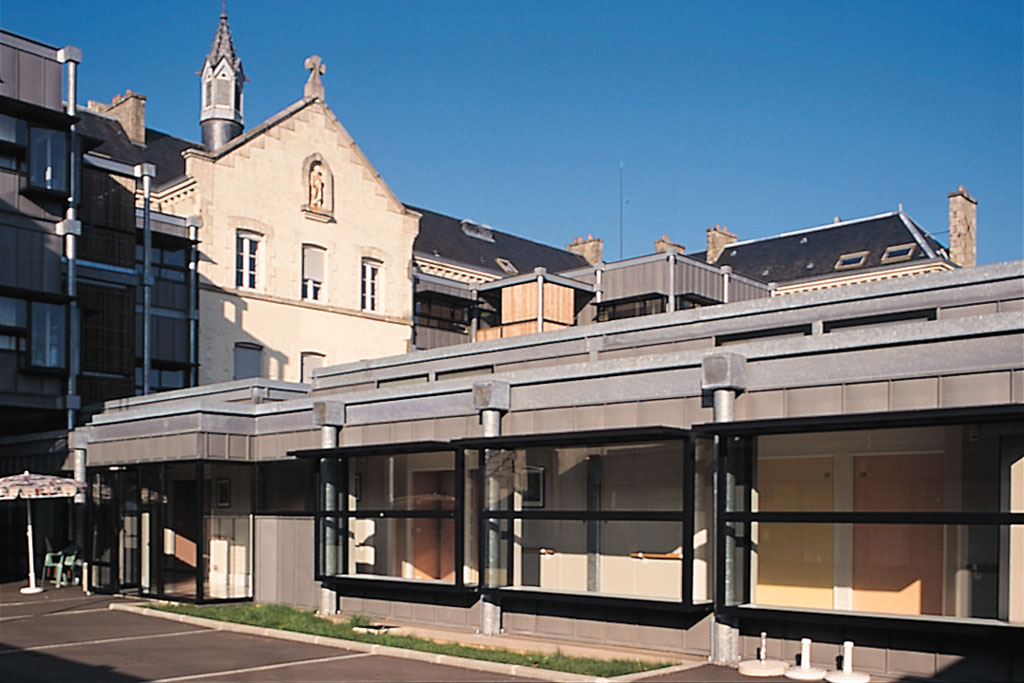 La restauration et l'extension de la résidence furent guidées par la puissance de caractère du bâtiment existant : une structure du XIXème siècle, bien entretenue, très axée sur la chapelle, fortement symétrique, reflet des institutions hospitalières religieuses du siècle dernier. La restructuration se veut un parallèle entre de la trame historique, les matériaux traditionnels et matériaux contemporains. La volumétrie a été pensée dans le sens d'un apport maximum de lumière naturelle, tant au niveau des circulations, que des chambres et des salles d'eau.