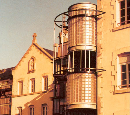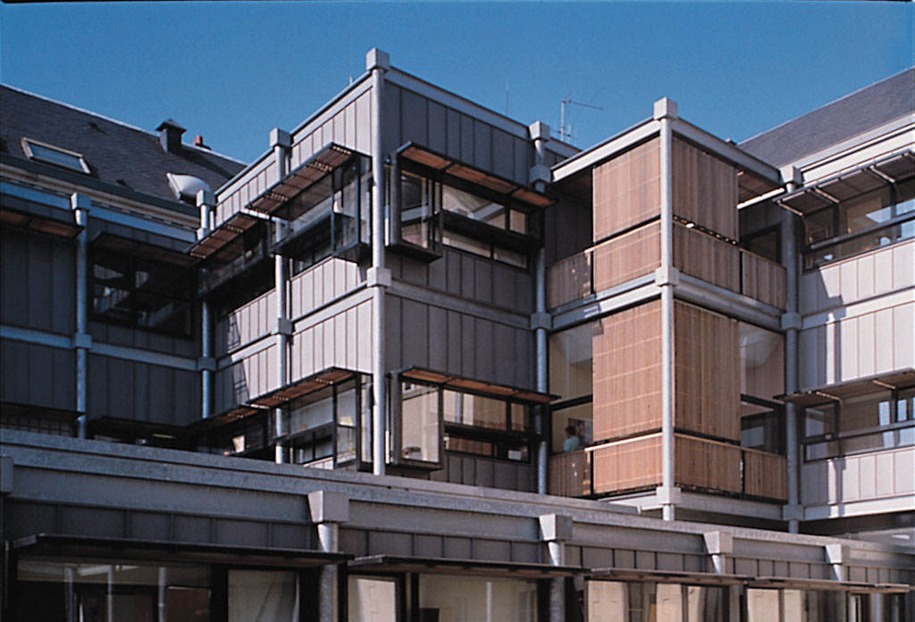Une structure d'acier galvanisé forme la trame de support pour la nouvelle façade. Le matériau de remplissage de celle-ci devait contribuer à la fois à la mémoire du lieu, palimpseste des structures enfouies, et assurer une pérénité sans faille : le quartz-zinc s'est imposé.
