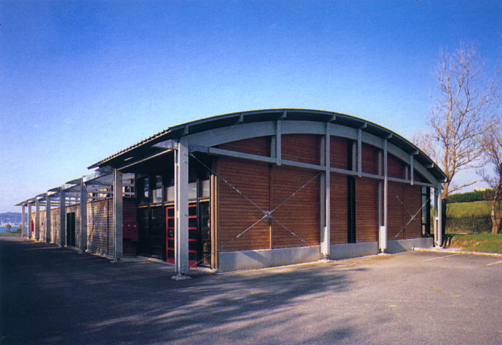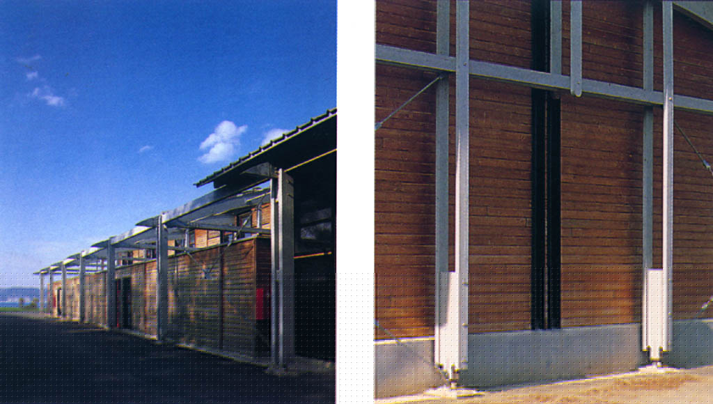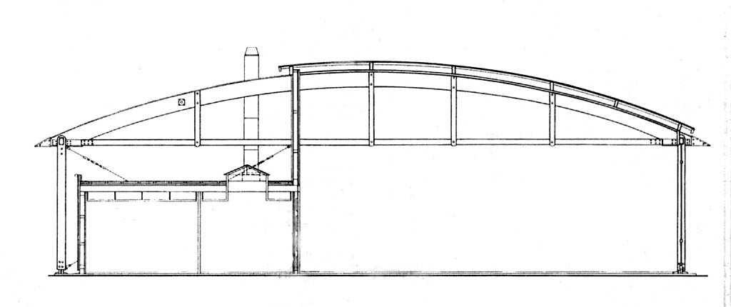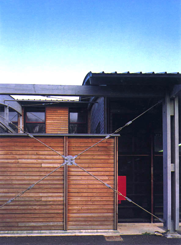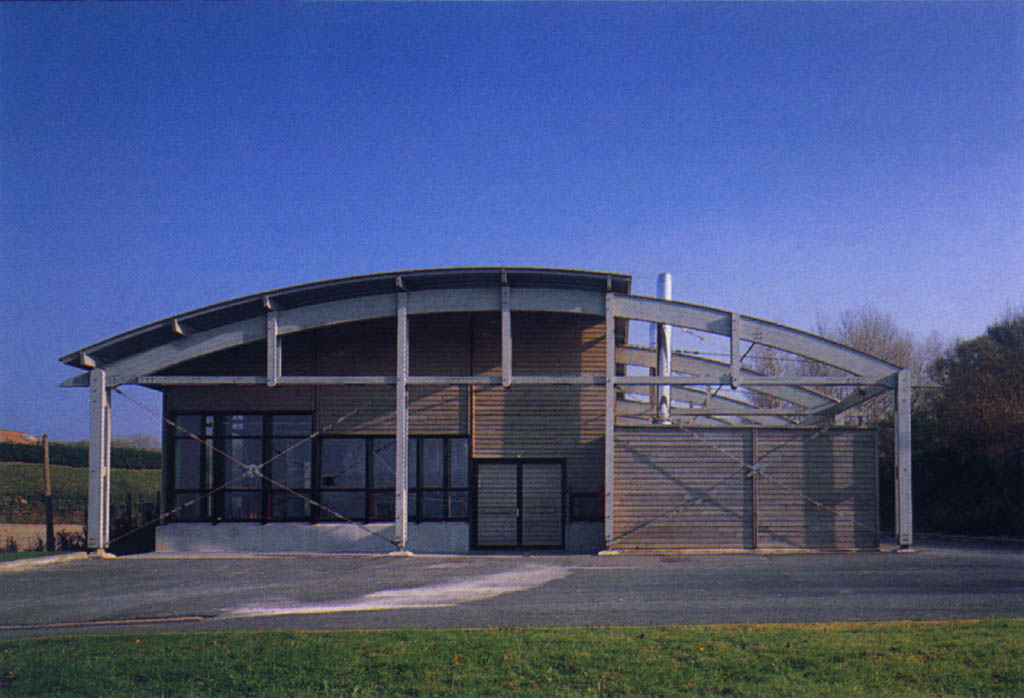 en cables tendus. La toiture courbe, couverte par