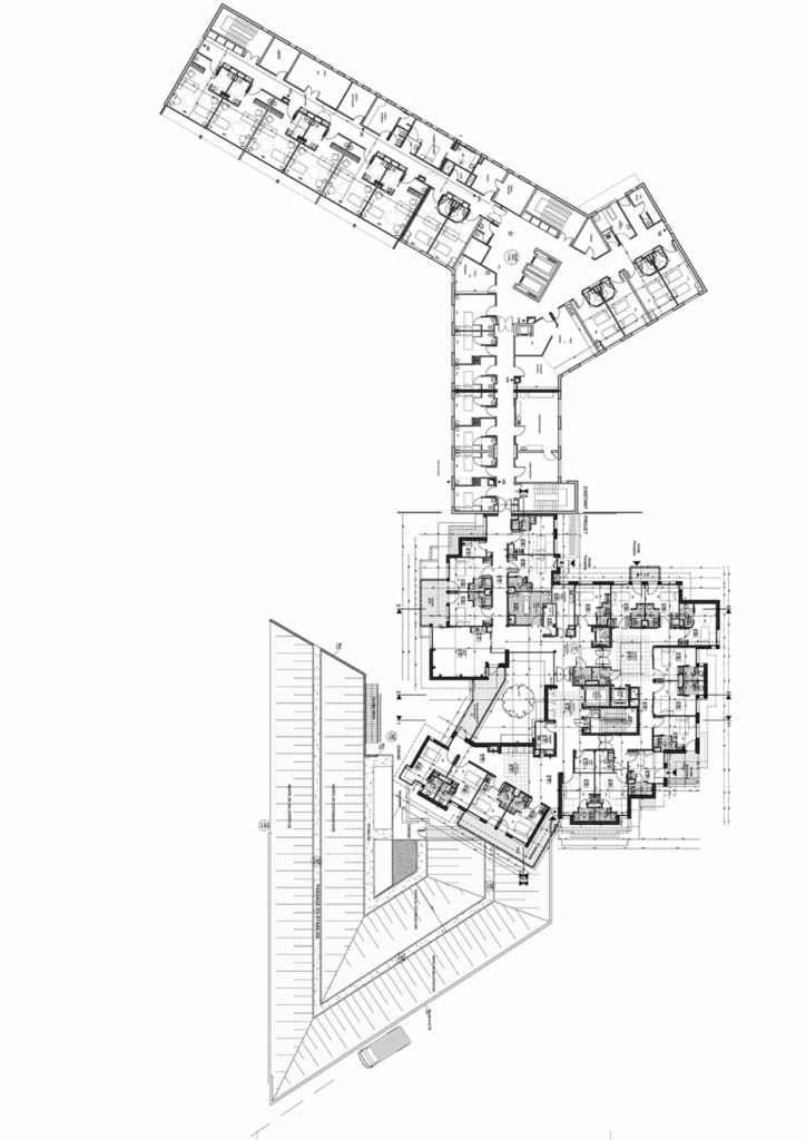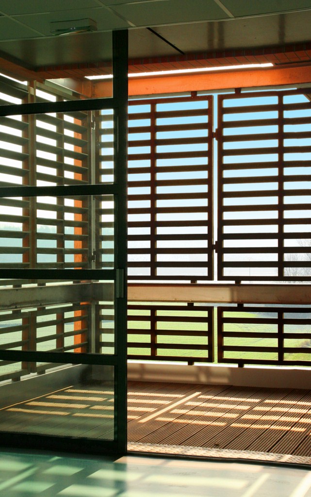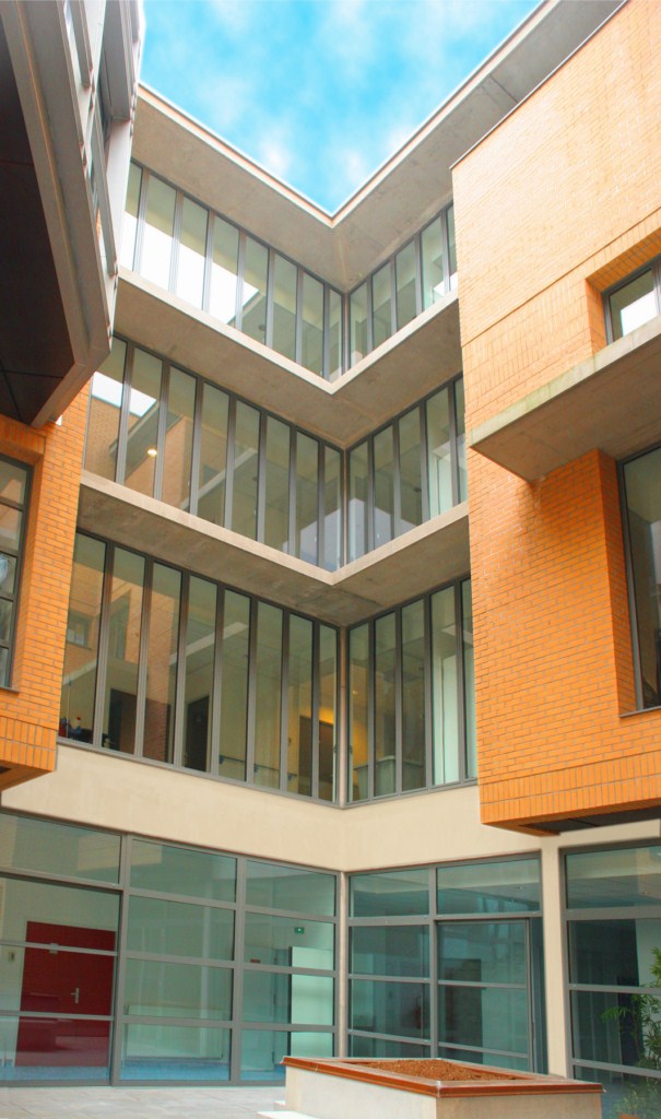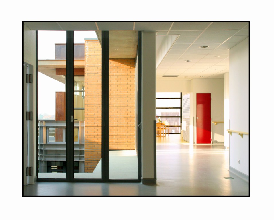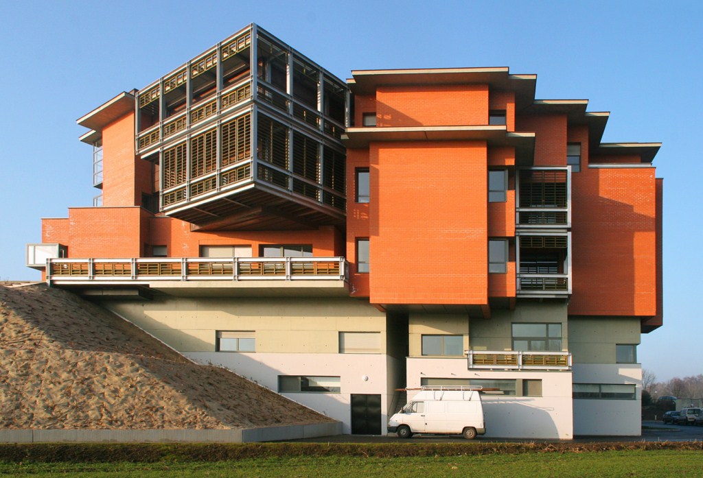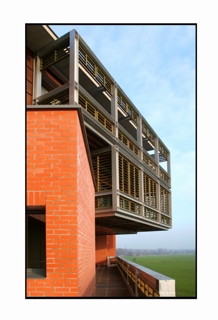Une extension d’un établissement de type V120 des années 80. Conçu autour d’un patio, le projet en R+4 est réalisé en briques du Nord et métal galvanisé pour les porte-à-faux. Le patio toute hauteur permet de se voir, se rassurer, aussi bien pour les patients que pour le personnel. Un talutage à la « Vauban » rattrape les niveaux existants, accident architectural et paysager pour les horizontales de ce plat pays.