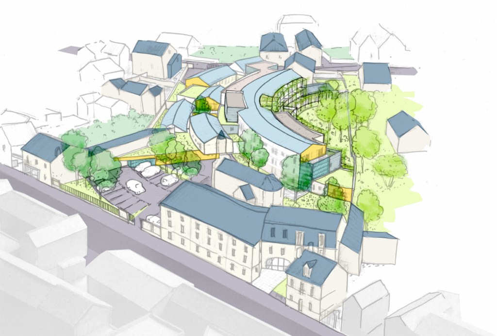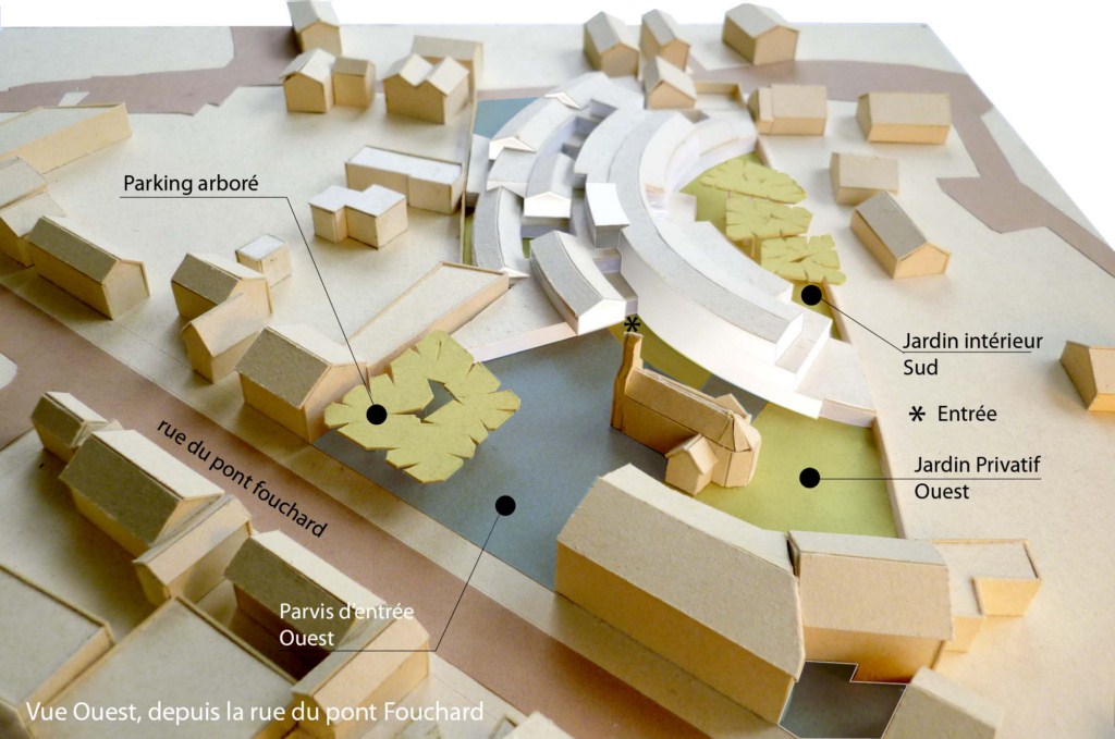 Une maison d’accueil pour nos anciens, en cœur d’îlot selon des volumes ouverts au soleil en courbes parallèles à différents niveaux.