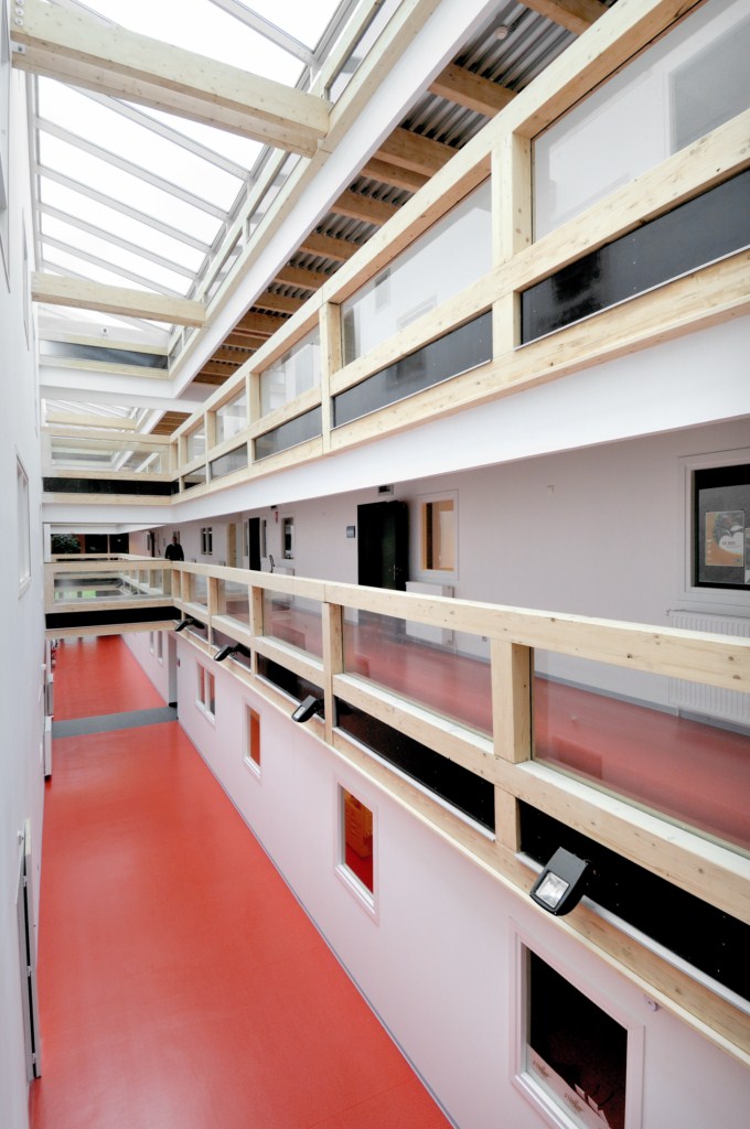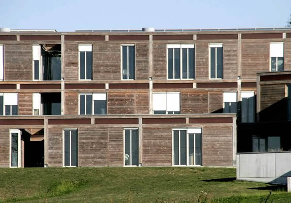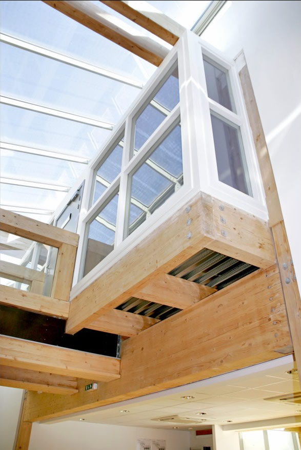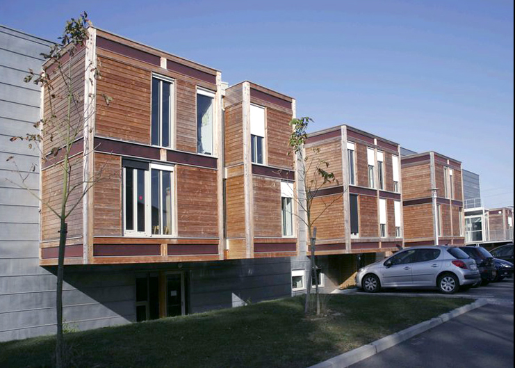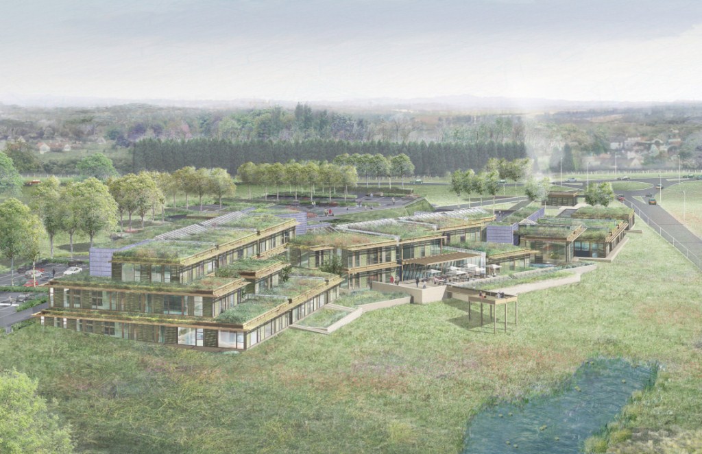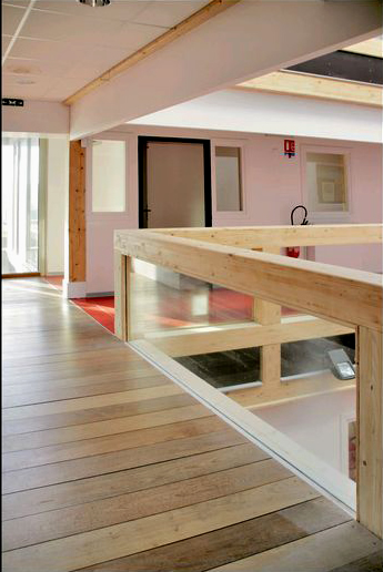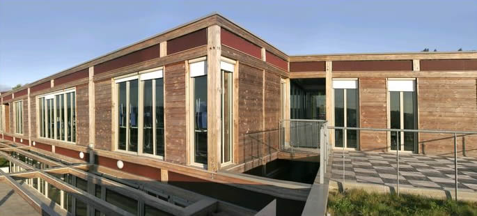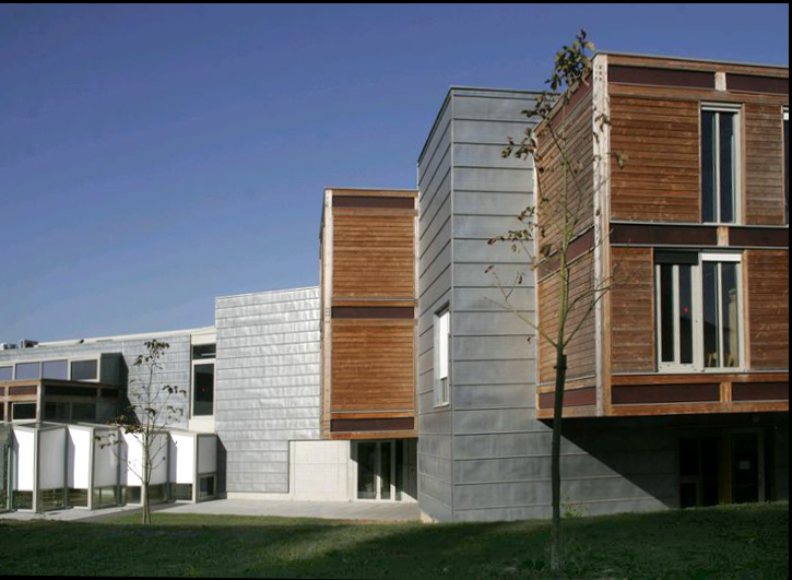 Trois parallélépipèdes plantés extraits du sol pour 10 000m² de bureaux à ossature bois lamellé-collé poteaux-poutres en R+2 avec rues intérieures de distribution sous verrières. Cubes de bois en porte-à-faux jaillissant des volumes recouverts de bardage zinc prépatiné quartz, terrasses plantées et vues panoramiques sur Limoges.